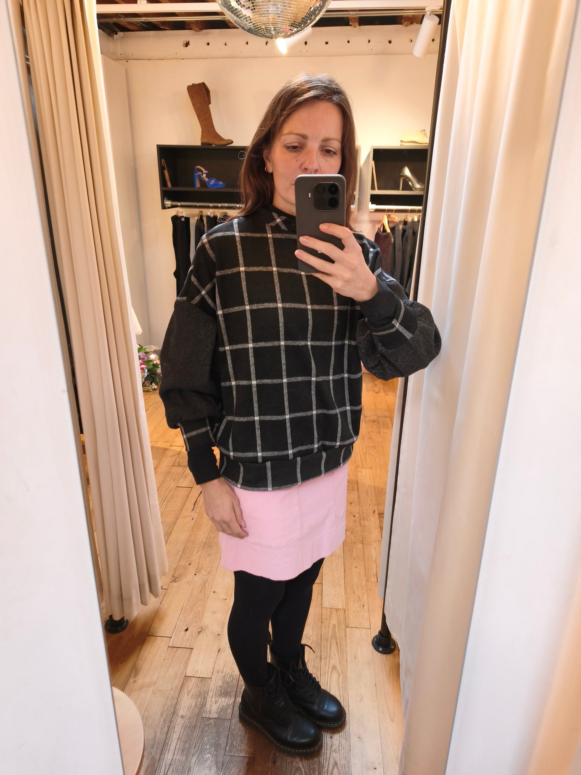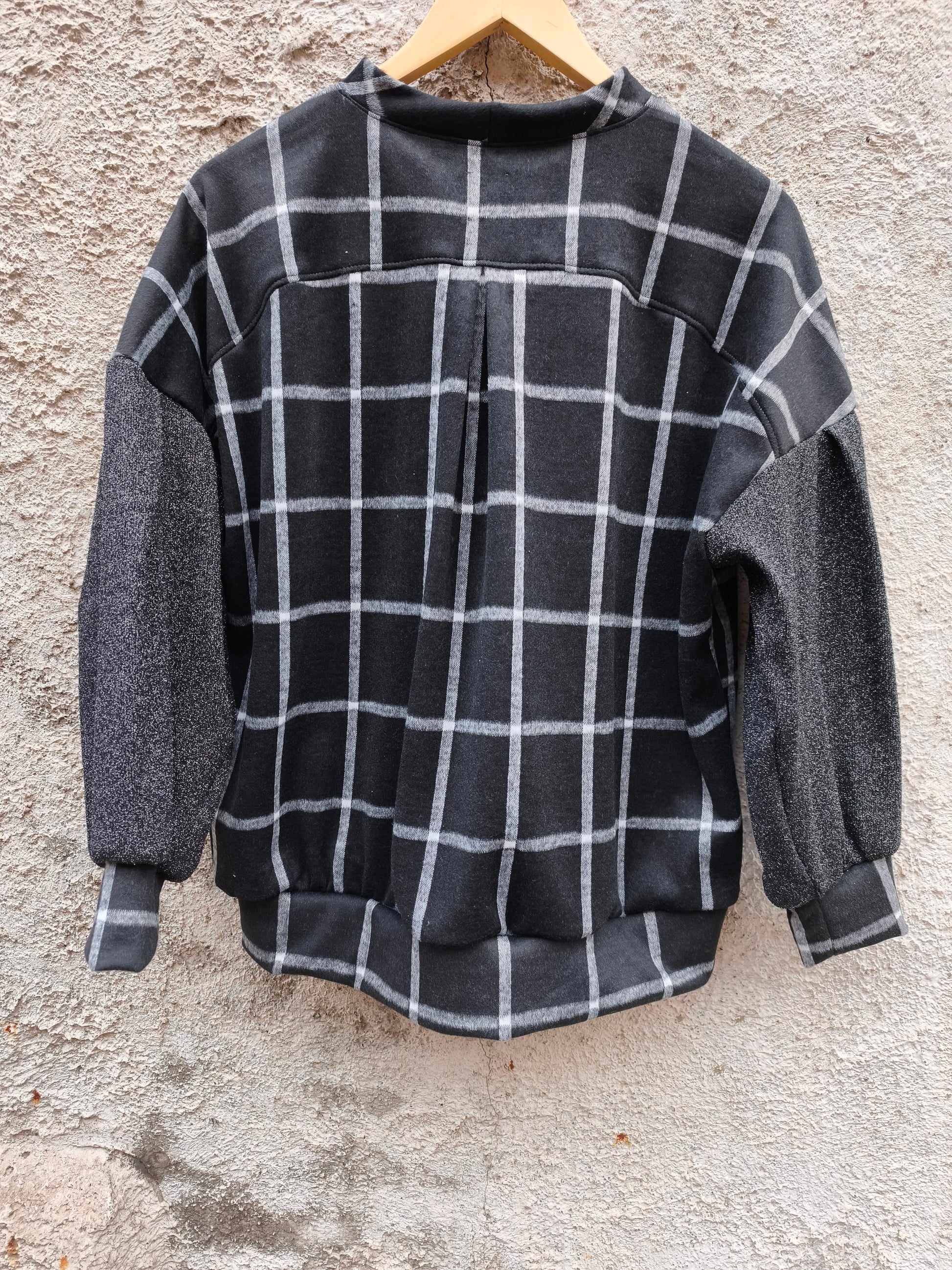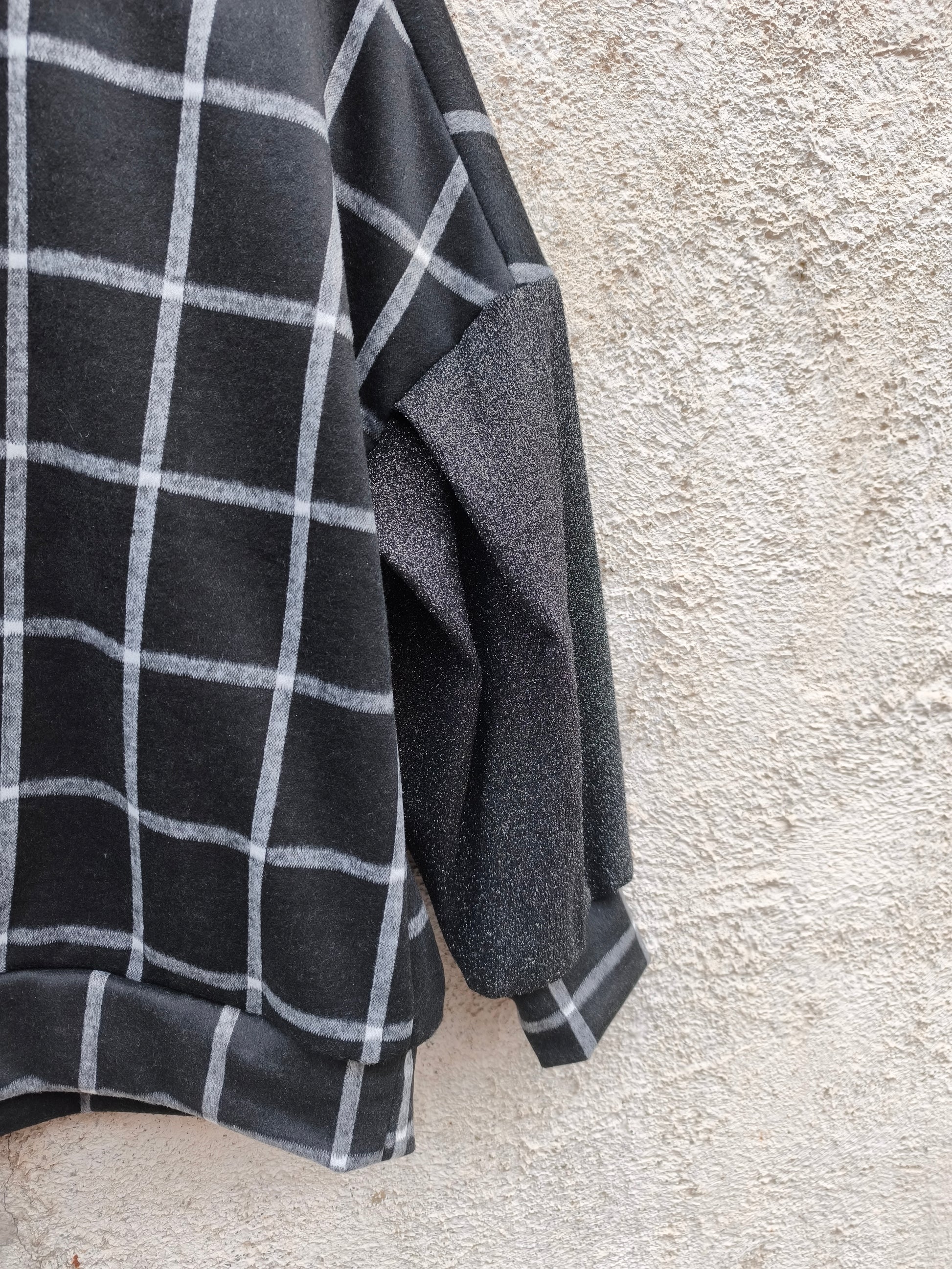 FABRIC: Wool black and white checkered tricot fabric by Collectors Club. Sleeves in black glitter stretch leftover.