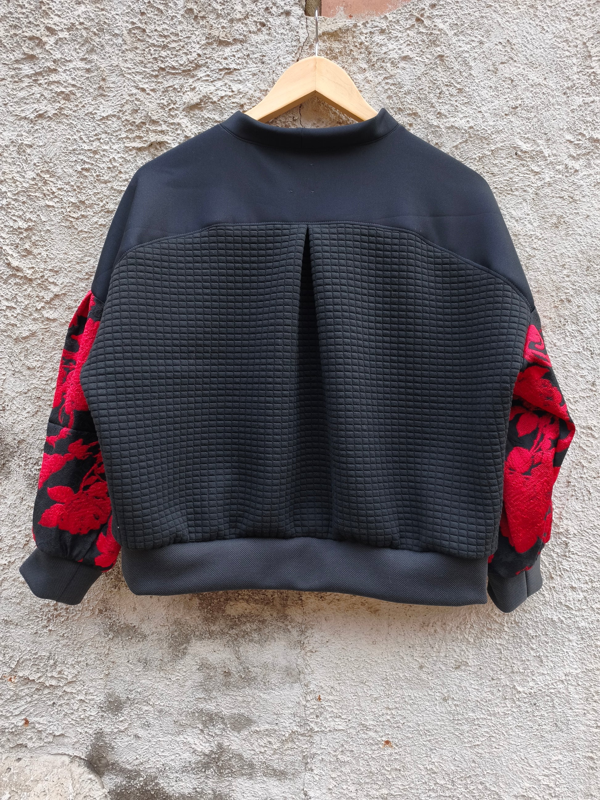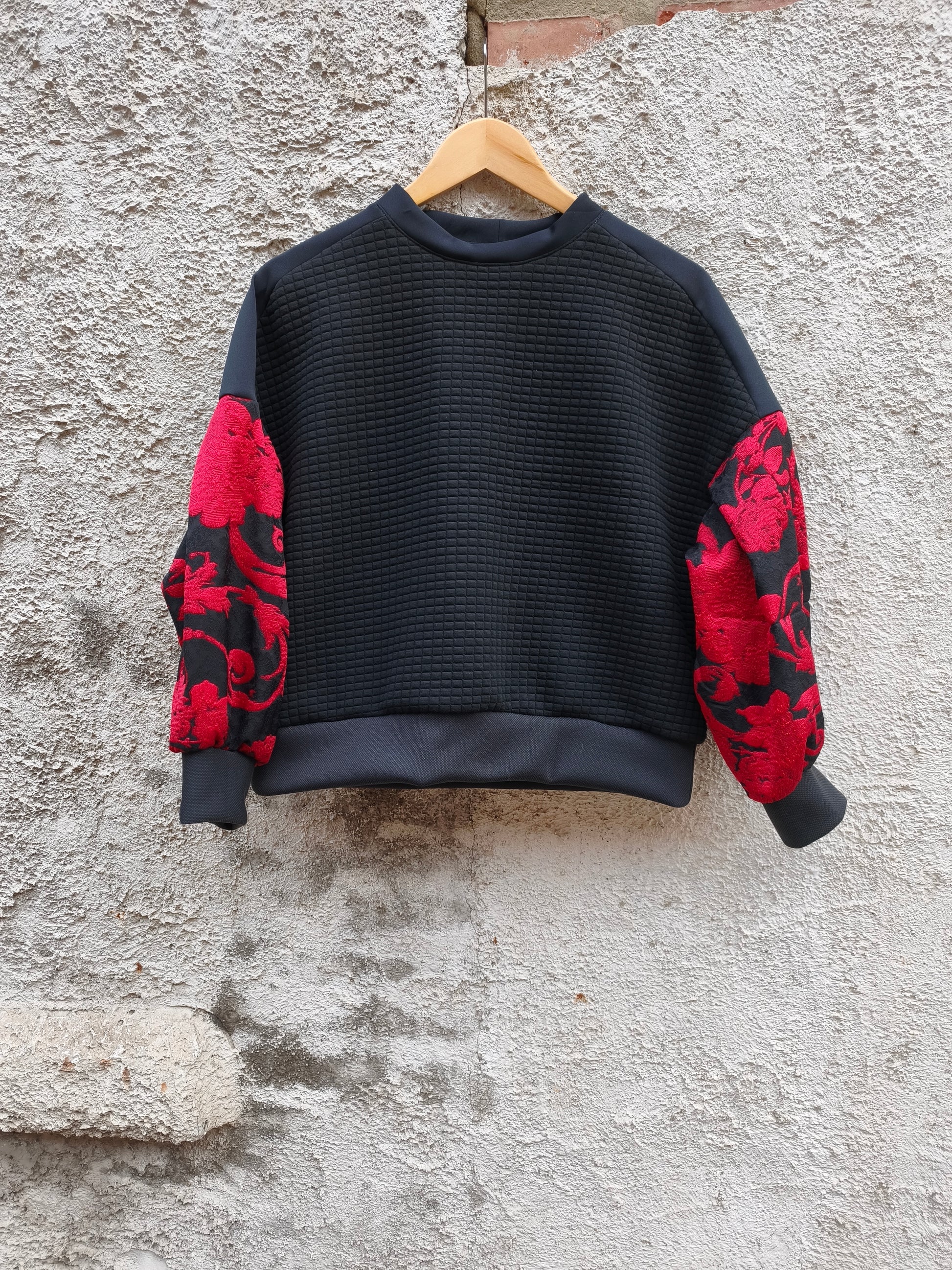 FABRIC: leftovers black tricot sweater fabric. Sleeves in black and red silk brocade leftover from production by Dries Van Noten.